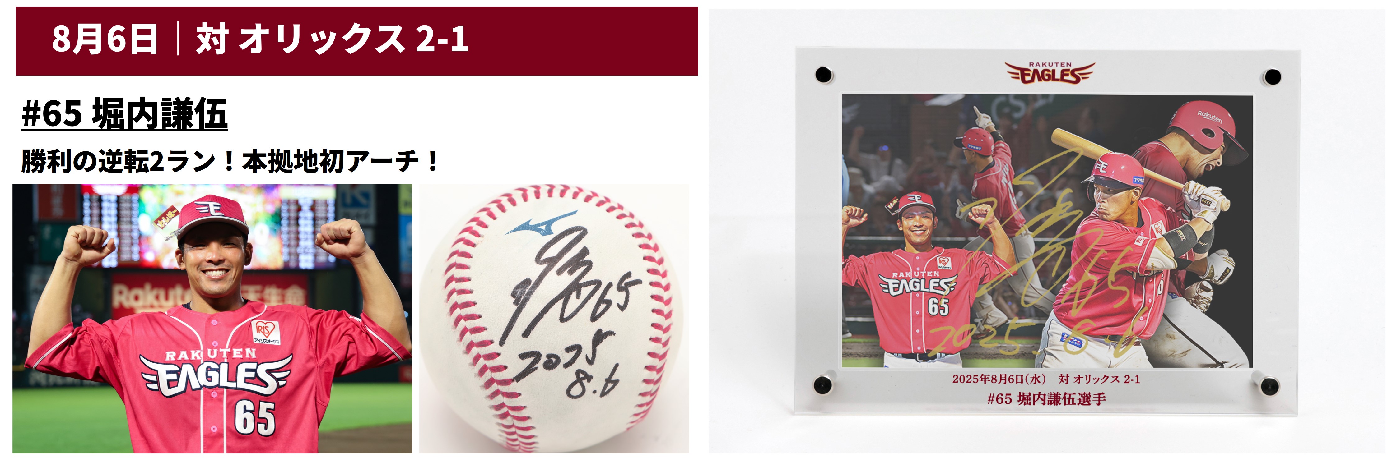 若き4番・黒川選手の劇的なサヨナラ打から始まり、岸選手の先発通算400登板、弘前でのボイト選手のグランドスラムなど、印象的な勝利とヒーローの活躍の記憶が蘇る8月のヒーローたちの直筆サイン入りヒーローボールとヒーロープレートを、オークションに出品します!