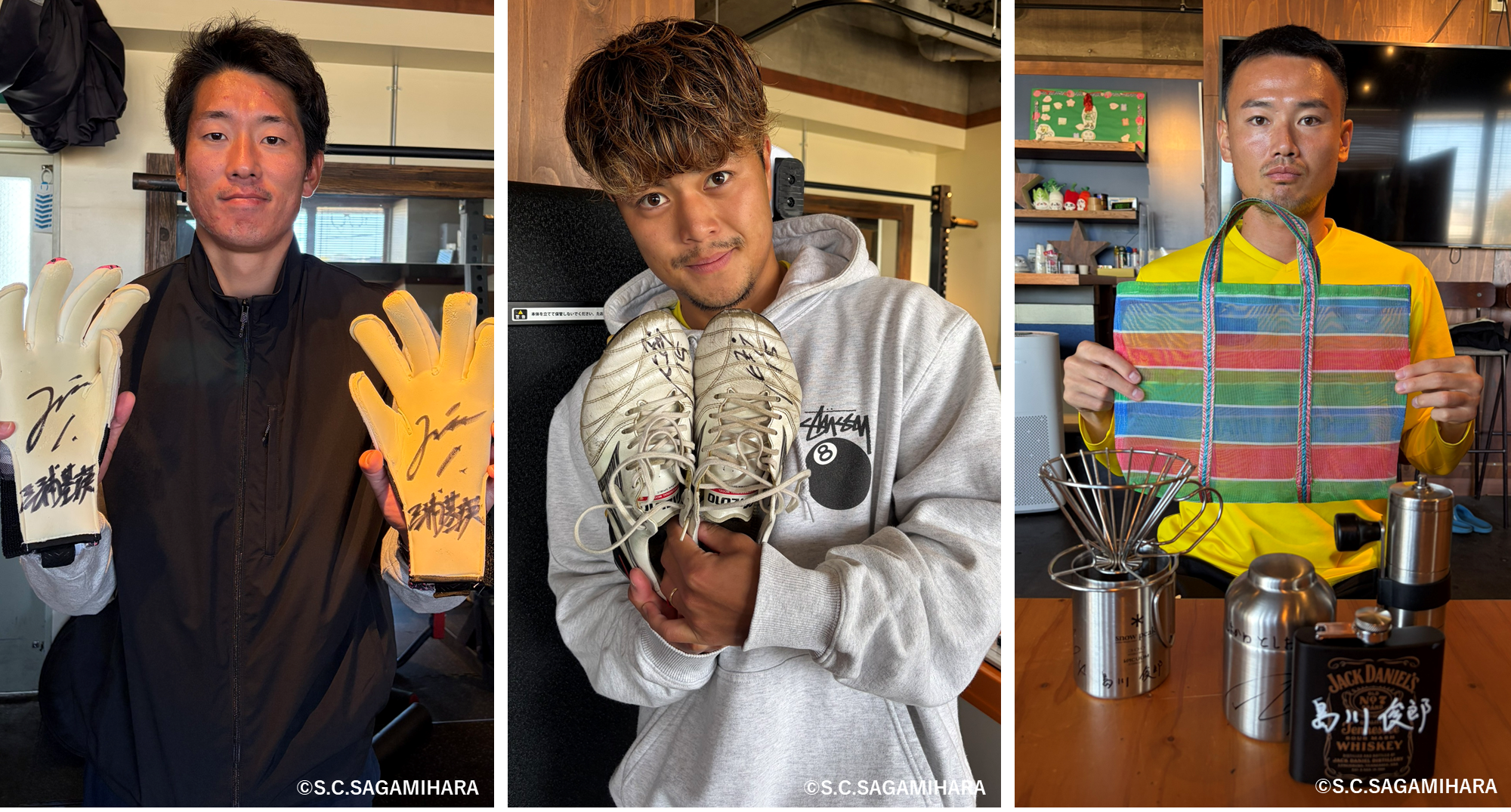今回出品するアイテムは、SC相模原に所属する選手たちのサインが入った『トレーニングシャツ』と2025シーズンに実際に使用した『スパイク』『キーパーグローブ』『トレーニングウェア』『コーヒーセット』です!