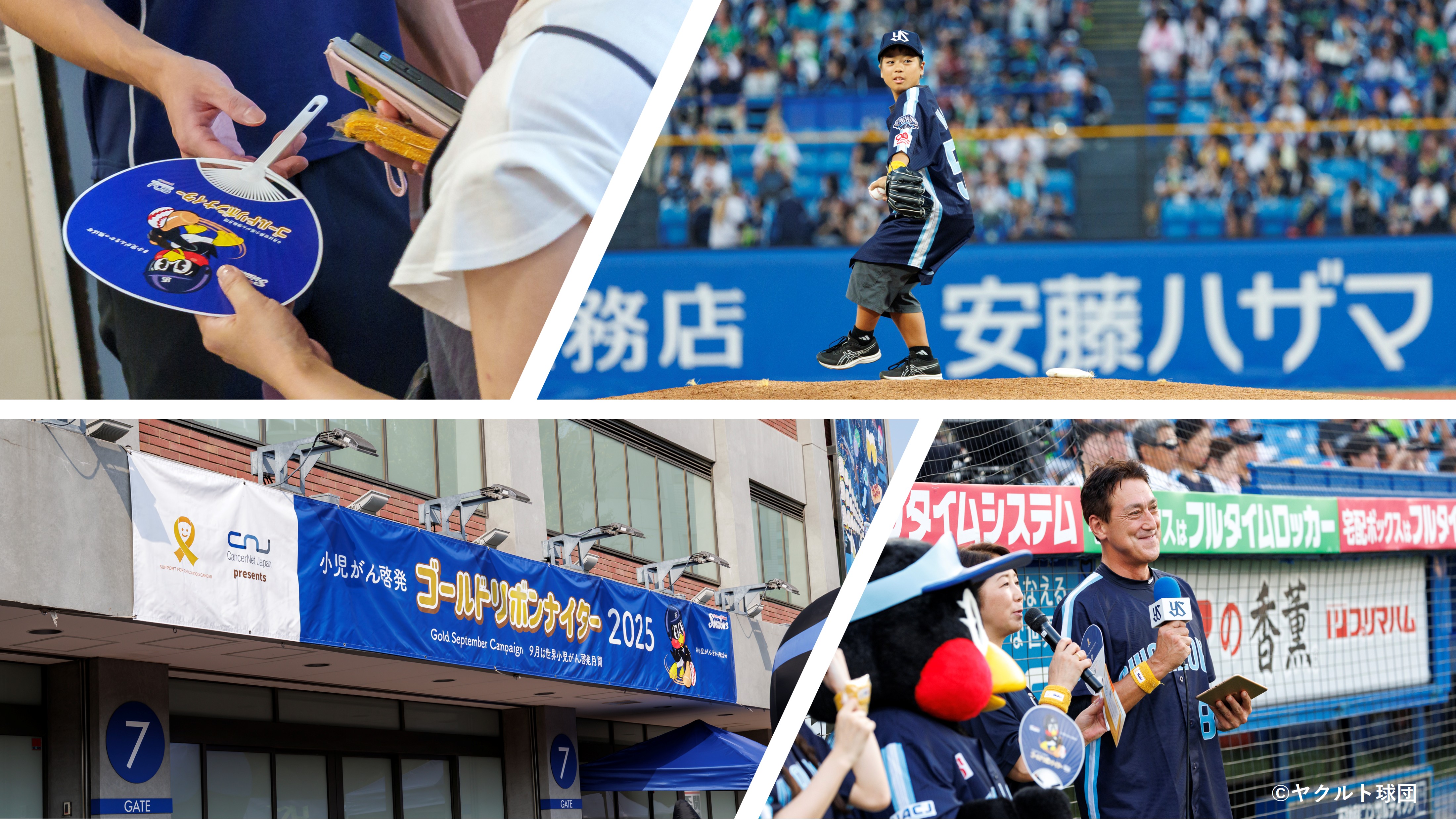 東京ヤクルトスワローズは、9月の「世界小児がん啓発月間」にあわせ、小児がんへの理解を広げ、治療に向き合う子どもたちやご家族、医療従事者などを応援することを目的として、2022年より「ゴールドリボンナイター」を実施しています。