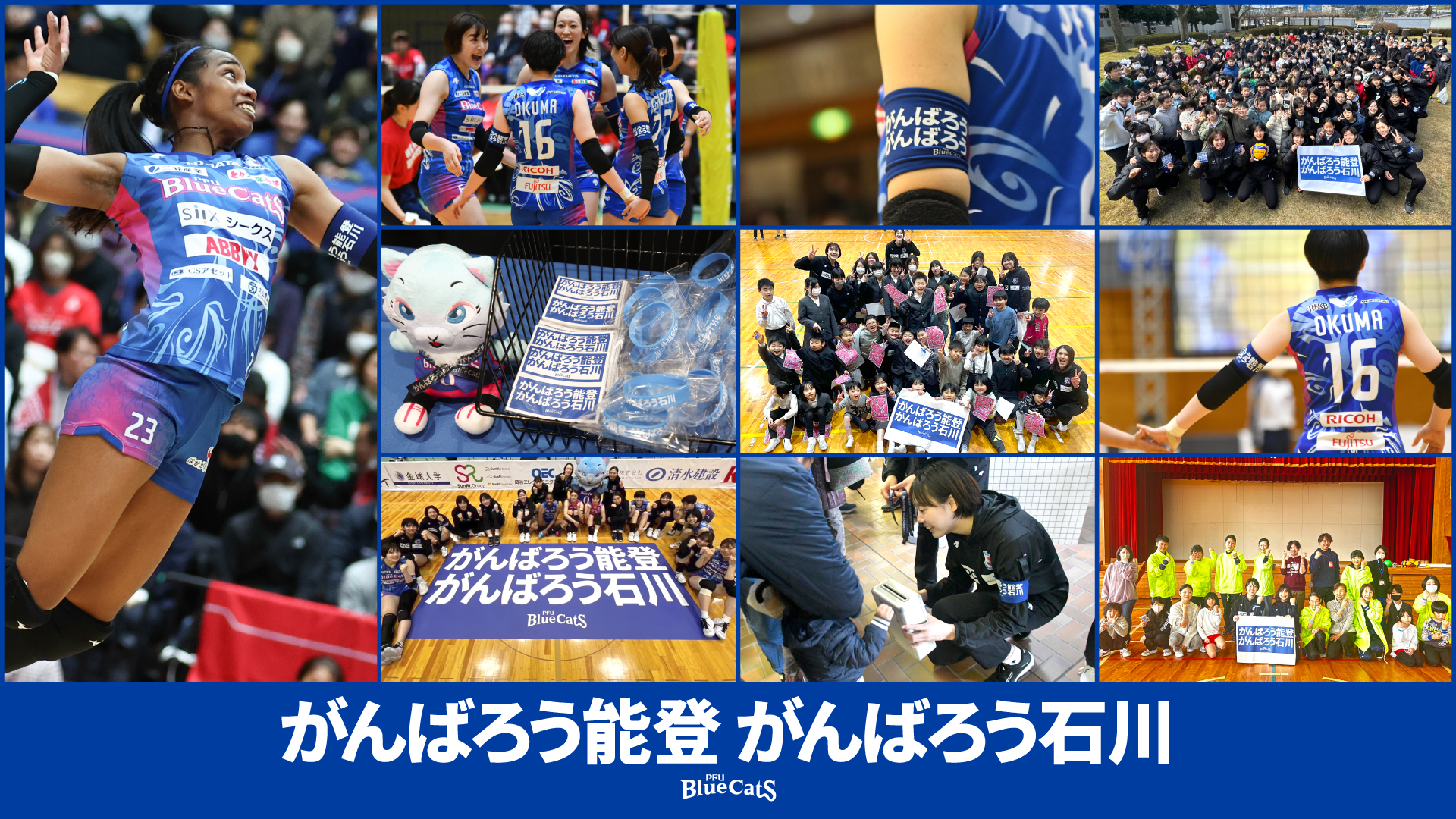 PFUブルーキャッツ石川かほくは、地元のプロスポーツチームとして、令和6年能登半島地震復興支援において、「自分たちに何ができるか?」「自分たちは何をすべきか?」を選手·スタッフで深く考え、 バレーボールで石川県民に対する支援の輪をつなぐことを使命として取り組むプロジェクトを始動しています。