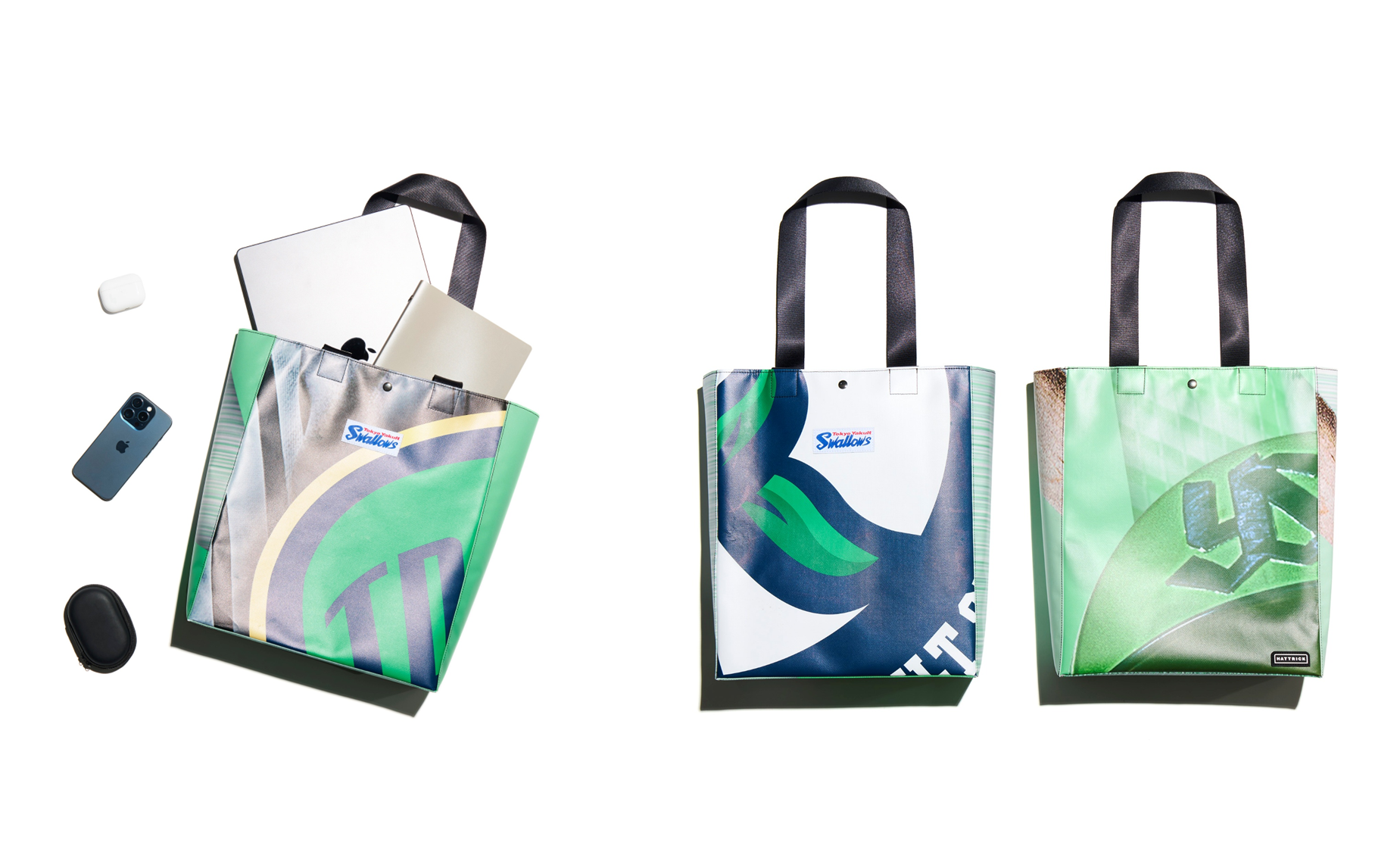 今回出品するのは、2023〜2025シーズンの「TOKYO燕プロジェクト」で、神宮球場に掲出されていた懸垂幕を再利用して制作したアップサイクルトートバッグです。